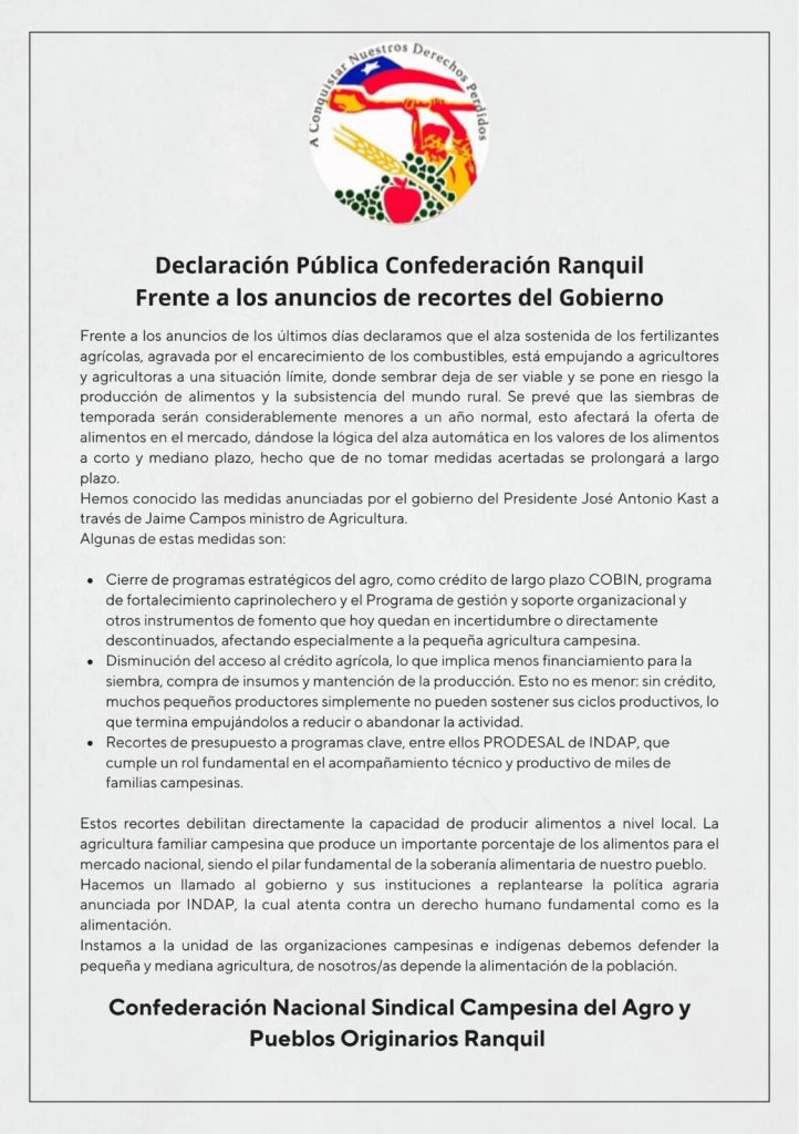 La Confederación Nacional Sindical Campesina del Agro y Pueblos Originarios Ranquil emitió una declaración pública en la que alerta sobre el impacto que tendrían los recientes anuncios del Gobierno en el sector agrícola, en un contexto marcado por el alza sostenida de los fertilizantes y el encarecimiento de los combustibles.